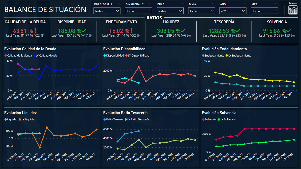 - Ratios del balance: calidad de la deuda, disponibilidad, endeudamiento, liquidez, solvencia, gráficos de evolución.